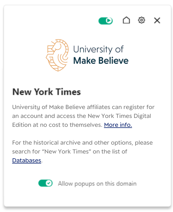 An example of an Assist Message popping up to let the student know they can access New York Times via their library