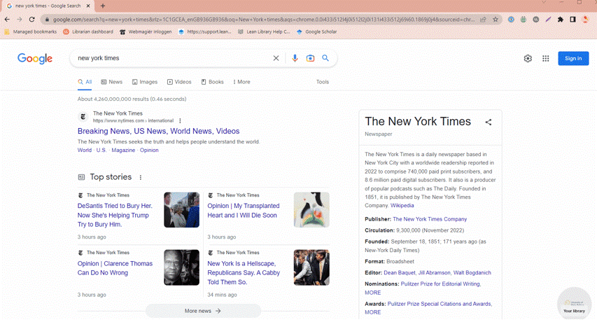 As context: the name LexisNexis is better known than the name of the database, Nexis Uni. A Google search for ‘Nexis Uni’ brings students also to a LexisNexis page (with a login option that only works when you are connected to the network of the university). The link Nexis Uni is a friendly LibGuide URL, which is an EZproxied URL, so students can easily access the database when they are off-campus.