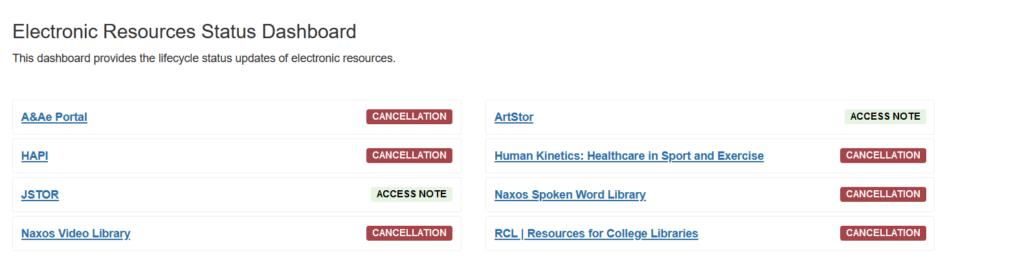Overview: The Electronic Resources Status Dashboard was developed using Springshare's System Status Management system to communicate changes efficiently. Updates are shared via email, MS Teams, and the dashboard, benefiting both internal and external users. It links to library pages, informing users about resource changes promptly. Explore it here: Electronic Resources Status Dashboard.