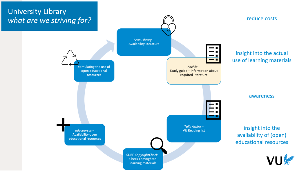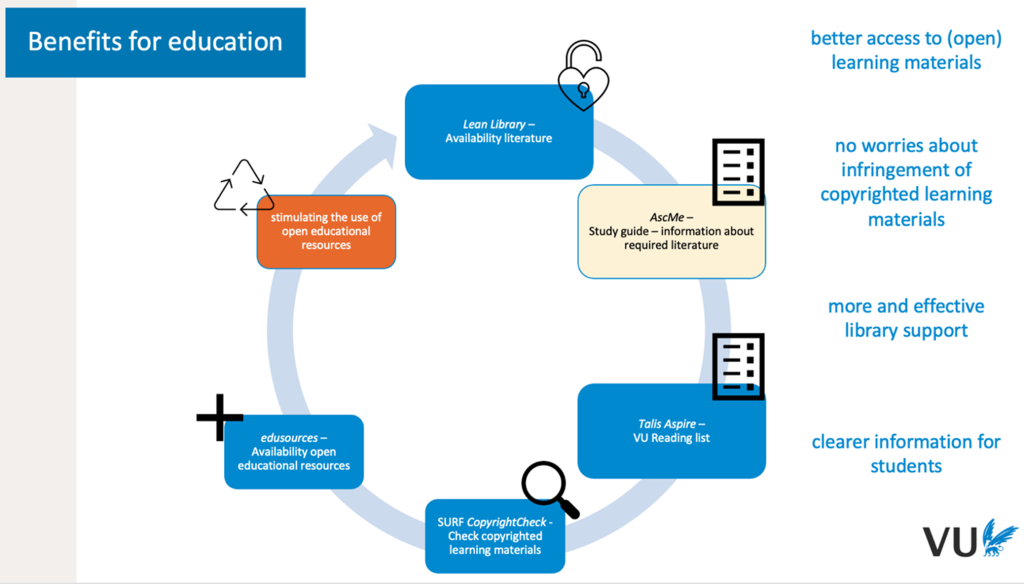This process of gathering the necessary information makes up their educational program, VU refers to as the Academic Structure & Content Modelling Environment (AscMe). Together with the supplier (TimeEdit) the VU is working to expand opportunities of AscMe on providing literature-information. With the goal being that when a program director adds literature to AscMe, it will be -via Talis Aspire- directly integrated with VU’s LMS. This will mean that lecturers and students will always have the right information available on reading lists. With this landscape in place, VU will get greater usage insights and a nice overview of the required literature being used in education. This bridges the gap between lecturers and students when it comes to considering the right content, together with reducing copyright infringements.